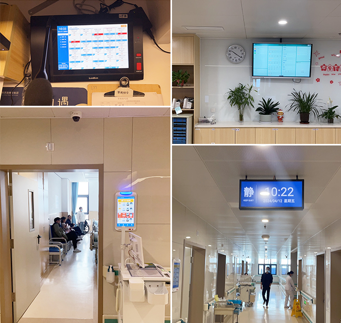 在安徽省肿瘤医院智慧病房内,具有智能信息交互显示的“护士站智慧大屏”、“床旁终端”、“护士站信息交互主机”、“病房门口机”等智能化设备一应俱全,让智慧赋能,全面打造高质、高效的“智慧病房”。