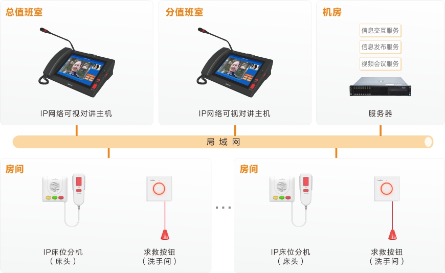 健康驿站隔离酒店对讲系统 基于IP网络架构(可跨网段跨路由),以高清音视频编解码技术为核心,集成对讲、广播、信息发布、视频会议等功能,构建了一套功能完善、扩展性强、实时性高的联网式音视频实时交互平台,主要用于隔离酒店的日常管理和突发事件的指挥处置。