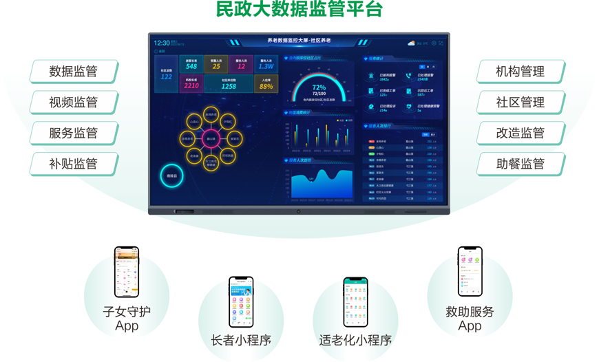 民政办 公室 | 机构养老管理 社区养老管理 家庭床位管理 长者基础档案 民政监管 信息发布 呼叫中心 项目管理 | / | 套 | 1 | 含云服务(B/S架构), 支持多级架构。 |